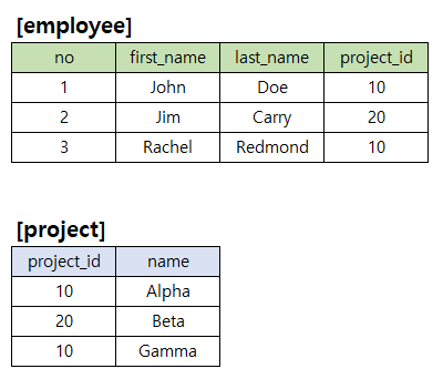 3. 아래의 employee테이블과 project테이블을 참고하여 보기의 SQL명령어에 알맞는 출력 값을 작성하시오.
