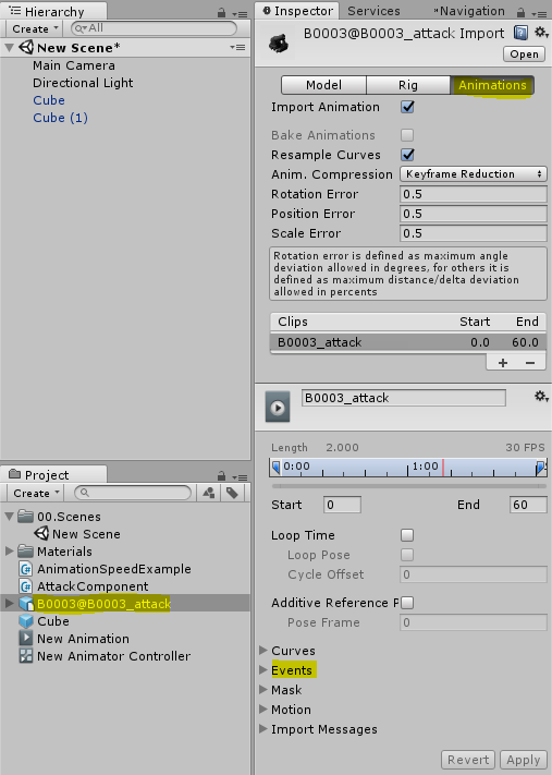 방법 1 : FBX 모델과 함께 임포트된 애니메이션에서 애니메이션 이벤트 사용하기