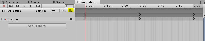 프로젝트 창에서 애니메이션클립을 선택하고 애니메이션 탭을 열면 다음과 같은 화면을 볼 수 있다.(만약 애니메이션 탭이 보이지 않는다면 상단의 Windows 메뉴에서 Animation을 찾아서 열거나 Ctrl+6 단축키를 이용해서 열 수 있다)