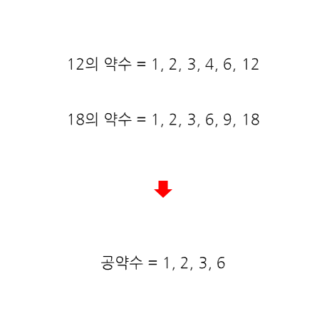 서로 다른 두 자연수라도 약수를 구해보면 똑같이 공통된 약수가 있다. 예를 들어 자연수 12와 18의 약수를 구해보면 아래와 같은데, 이 중에서 1, 2, 3, 6은 똑같이 공통된 약수다, 그리고 이렇게 서로 다른 두 자연수의 공통된 약수를 보통 공약수라고 한다.