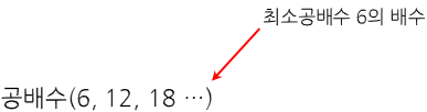 그리고 최대 공약수와 마찬가지로, 최소공배수를 알면 공배수 구하기가 쉬워진다 왜냐면 최소공배수의 배수가 바로 공배수이기 때문이다, 그래서 최소공배수인 6의 배수를 구해보면 자연수 2와 3의 공배수를 쉽게 구할 수 있다.